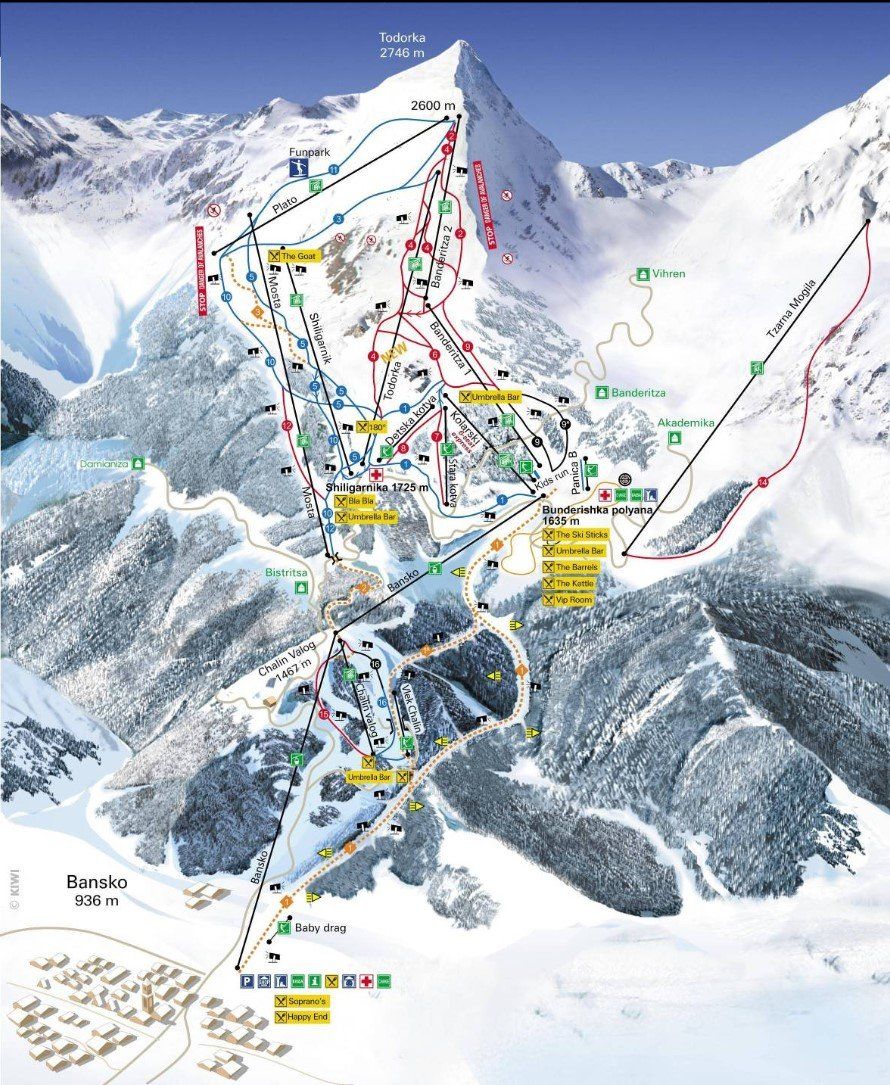 Dank der hohen Schneefallrate und der zahlreichen Schneekanonen ist das Skigebiet Bansko für seine Schneesicherheit bekannt. Für Abwechslung ist mit natürlichen Jumps und unterhalb vom Todorka Gipfel mit Freeriding durch die Wälder gesorgt. Für Profifahrer ist die Schwarze Piste namens Alberto Tomba genau das Richtige.