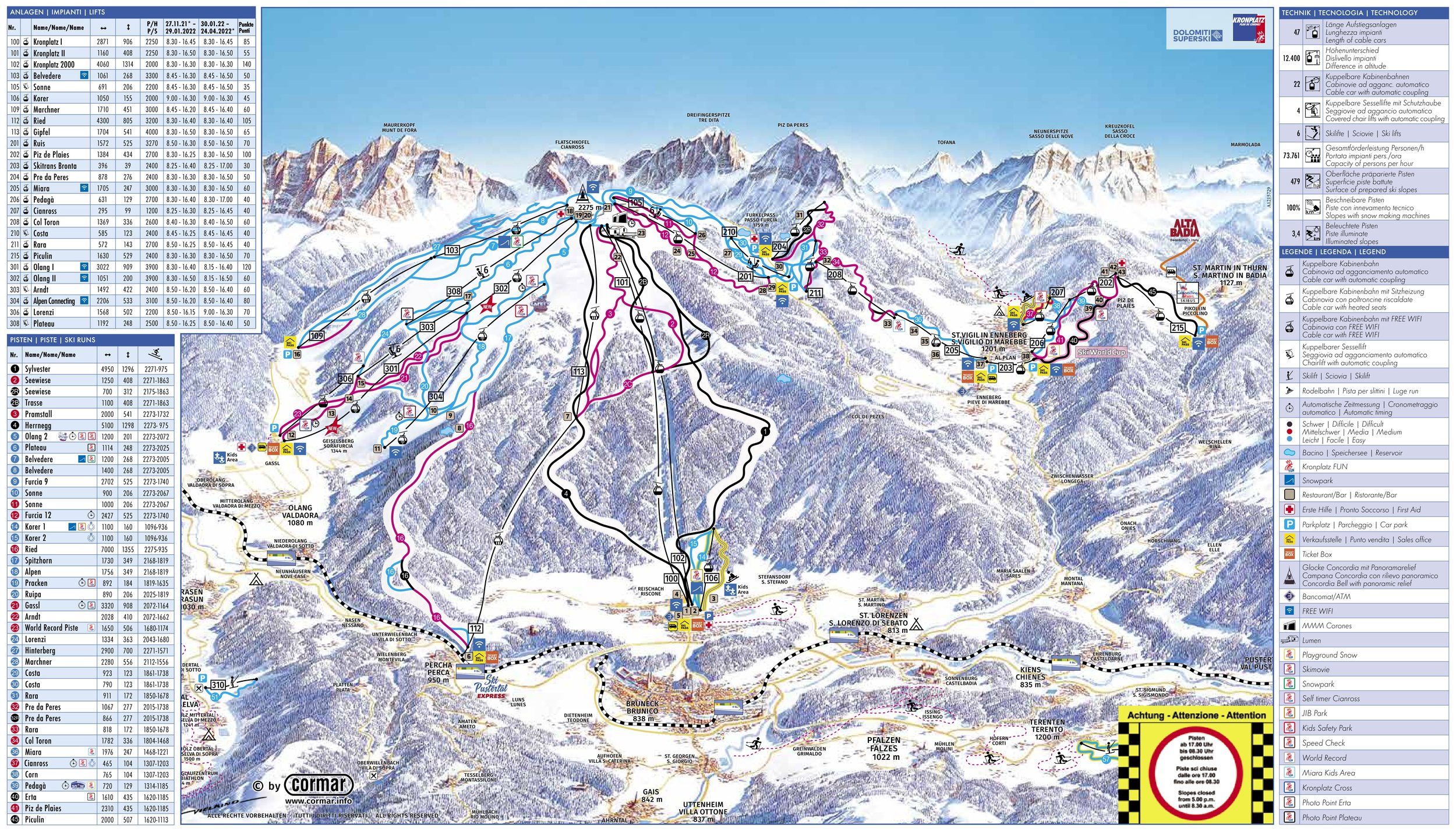 Am Fuße des Kronplatzes (2.275 m) und inmitten der malerischen Landschaft des Pustertals liegen 14 unterschiedliche und attraktive Südtiroler Orte. Gleich von mehreren dieser Ortschaften aus starten moderne Kabinenbahnen zum Gipfel, an dem sich ein imposantes 360-Grad-Panorama eröffnet. Diverse große Sport-Events wie z. B. der Pustertaler Skimarathon und der Gsiesertal-Lauf, das größte Sportevent Südtirols, finden hier regelmäßig statt. Rund 121 Pistenkilometer, 31 modernste Liftanlagen, eine Halfpipe sowie ein riesiges Loipenangebot bieten ein Wintersportangebot der Extraklasse. Das breit gefächerte Freizeit- und Sportangebot sowie das lebhafte Après-Ski sorgen für jede Menge Spaß abseits der Pisten! Auch auf Familien ist das Gebiet dank zahlreicher Einrichtungen wie der "Croniworld" bestens eingestellt.Anreise Gais-Uttenheim