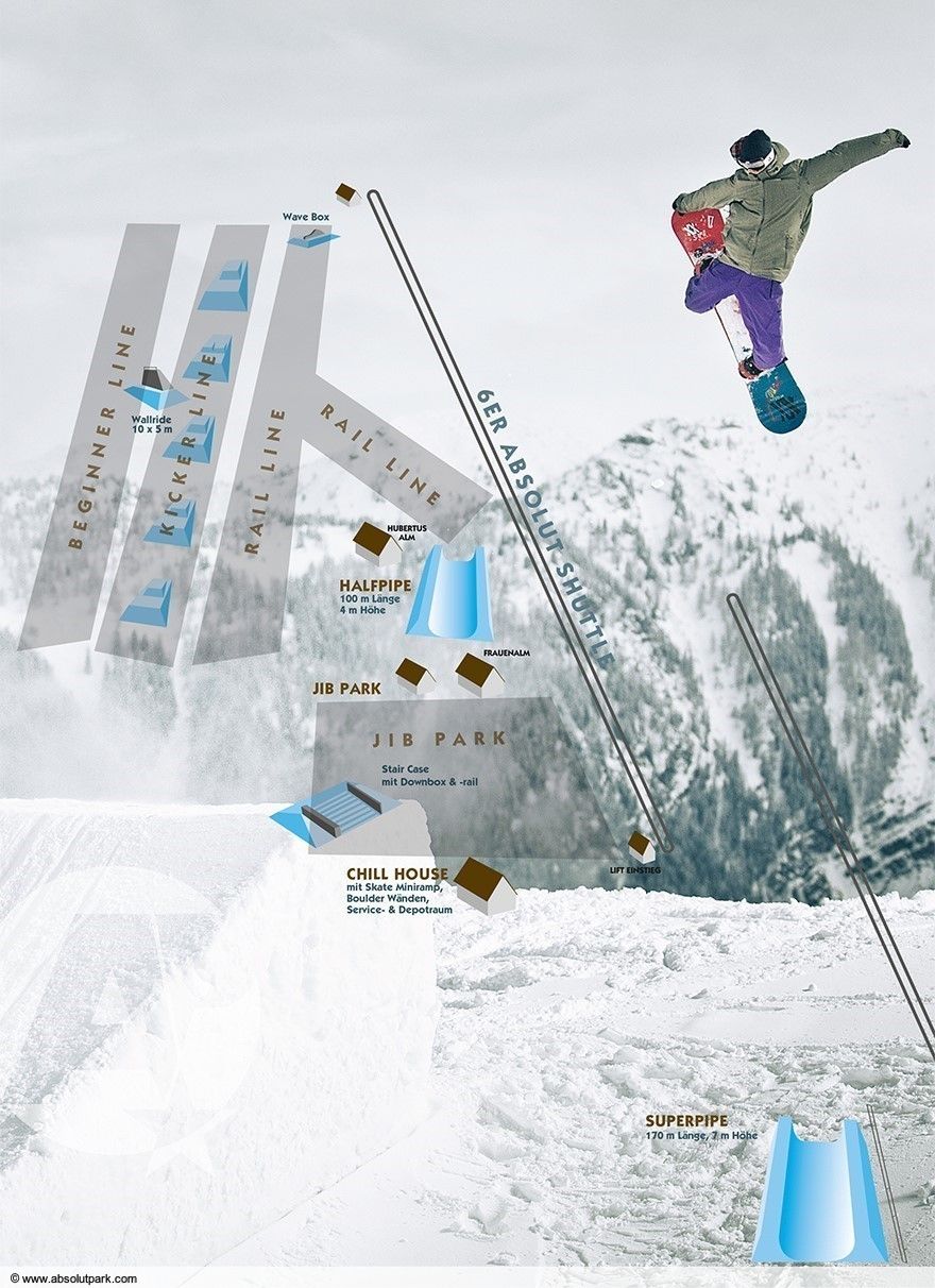 Wer nun glaubt, dass dieses ausgiebige Obstacle-Angebot schon das Ende war, der irrt. Denn der "Absolut Park" wartet nicht nur zusätzlich mit einer 100 m langen Halfpipe mit 4 m hohen Wänden auf Sie, sondern auch mit einer Superpipe. Das 160 m lange Monster befindet sich direkt oberhalb der Talstation "Family Shuttle" und entspricht der X-Games- und Olympia-Norm. Außerdem gibt es im Park ein "Chill House". Dort erfüllen sich dann auch noch die letzten Freestyle-Träume, denn hier gibt es weit mehr als fetten Sound, Videowalls und ausreichend Platz zum Relaxen. In dem zweistöckigen Haus befindet sich auch noch eine Mini Skate Ramp und ein massiver Boulderfelsen.