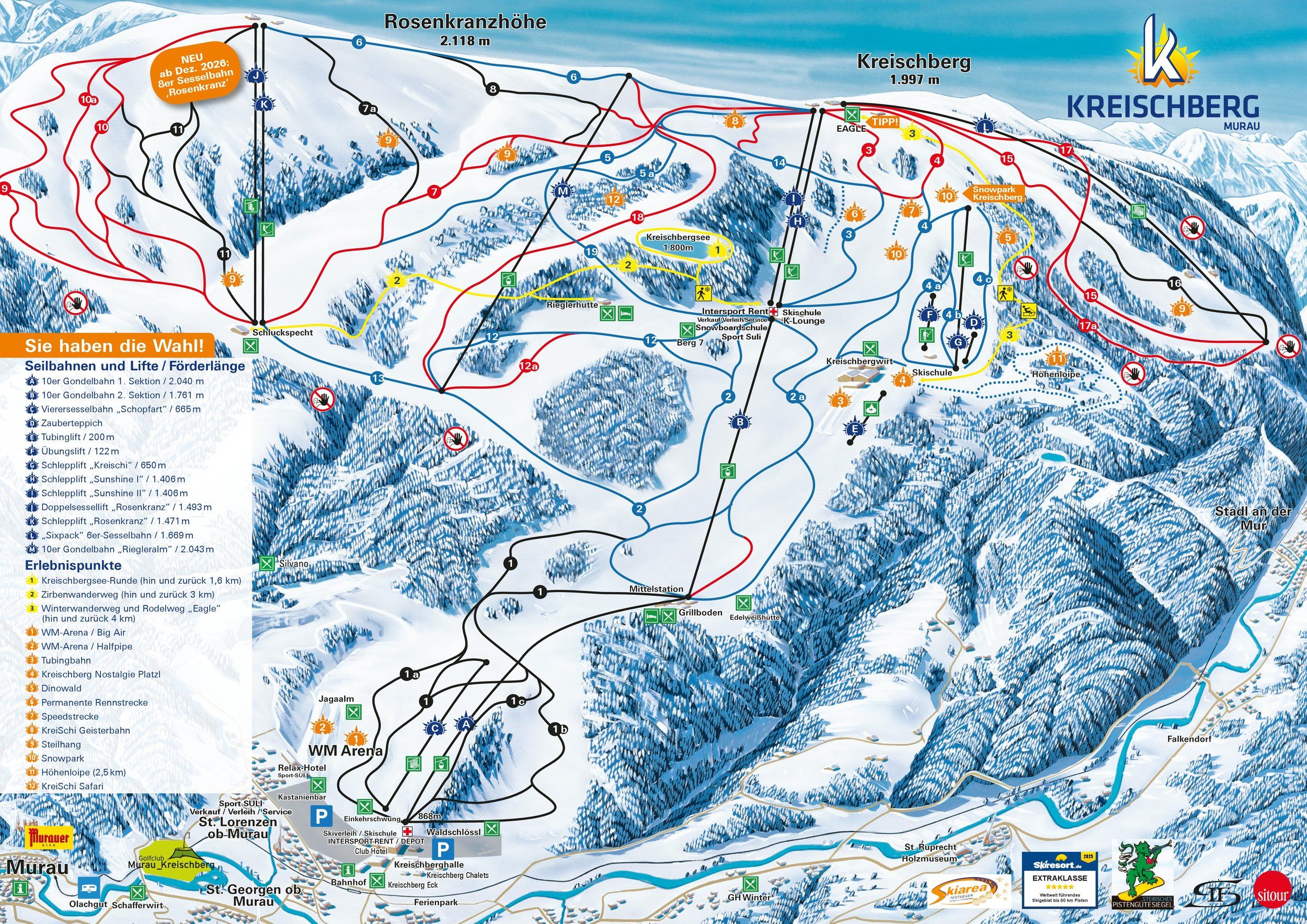 Das Skigebiet Kreischberg wurde in der Kategorie „Pistenpräparierung“ ausgezeichnet. Besonders hervorgehoben wird, dass auch die schwarzen Pisten sehr gut präpariert werden. Neben der ausgezeichneten Pistenpräparierung hat auch das Angebot für Familien 5 Sterne erhalten. Für die Kleinen gibt es ein Kinderland mit Wellenbahn, eine Tubing Strecke, Kreischi-Trampolin sowie Kinderbetreuung, Skikindergarten und -schule. Zusätzlich werden mit der "KreiSchi Geisterbahn", dem "Dinowald" und der "KreiSchi Safari" mehrere spannende Erlebnisparcours geboten. Das Restaurant Kreischbergwirt, welches sich direkt neben dem Kinderland befindet, bietet außerdem verschiedene Kindergerichte. Als neues Highlight gilt das Panoramarestaurant "EAGLE": Auf 2.000 m Höhe gibt es nicht nur einen fantastischen Ausblick, sondern auch eine breite Auswahl an Speisen und Getränken. Wer es eilig hat, der nutzt einfach den "Drive-In" für einen kurzen Einkehrschwung.